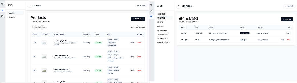 전문적인 기술 스택을 기반으로 뛰어난 퍼포먼스를 확보하는 동시에, IT 지식이 없는 담당자도 즉시 활용 가능한 맞춤형 관리자 시스템(Custom Admin)을 구축하였습니다. 복잡한 기능은 과감히 생략하고 실무에 필수적인 제품 및 팝업 관리 인터페이스를 최적화하여 제공함으로써 관리 자율성을 극대화했습니다.